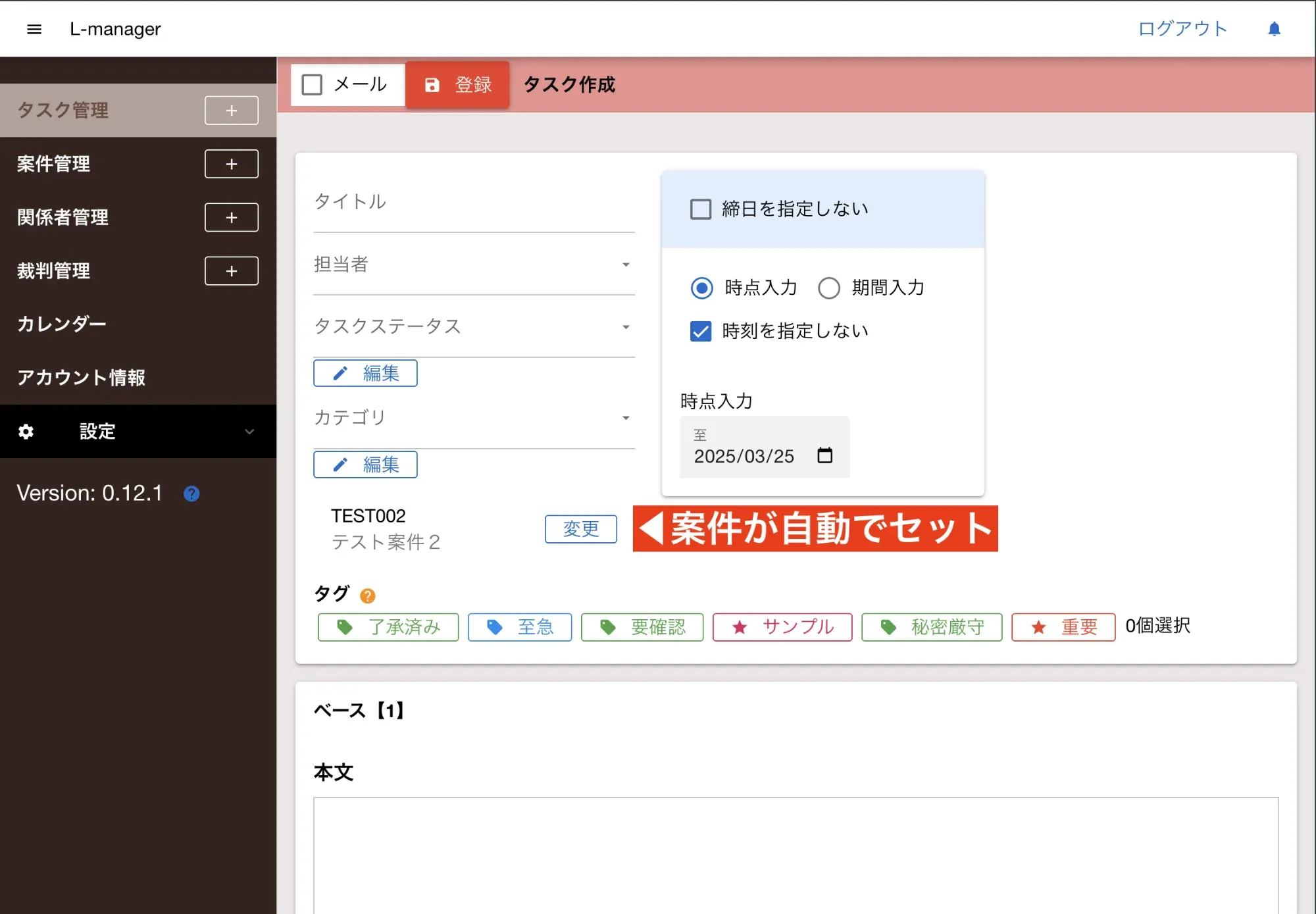 Section titled “案件からタスクを登録する”「案件タスク作成」をクリックすると、表示中の案件に紐づいた形でタスクを新規作成出来ます。