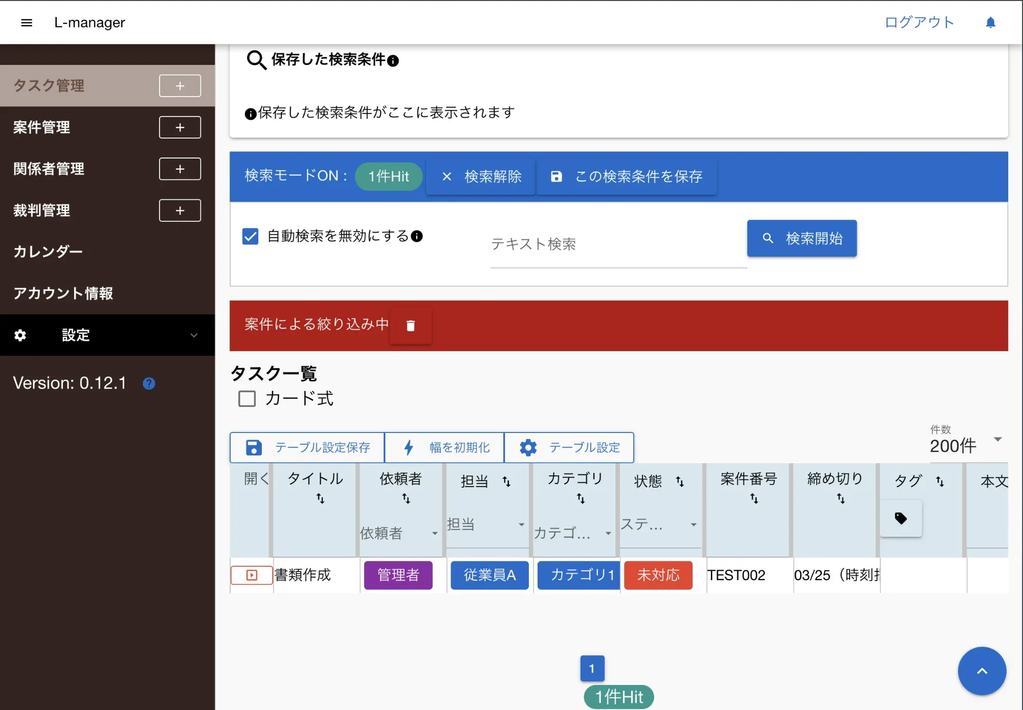 Section titled “案件に紐づいたタスクを表示する”「案件タスク表示」をクリックすると、タスク一覧画面に切り替わり、表示中の案件に紐づいたタスクの一覧を表示できます。 このとき、当該案件による「フィルター」がかかっている状態で表示されます。