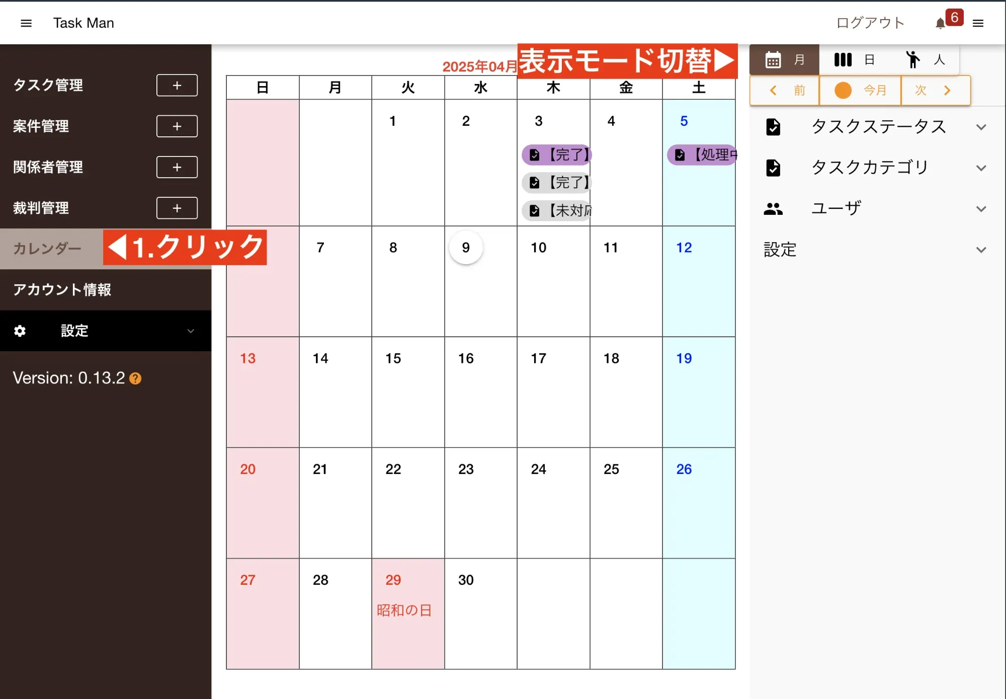 - タスクを登録してすぐにカレンダーに切り替えても表示されません(反映までに10秒程度の遅延があります)