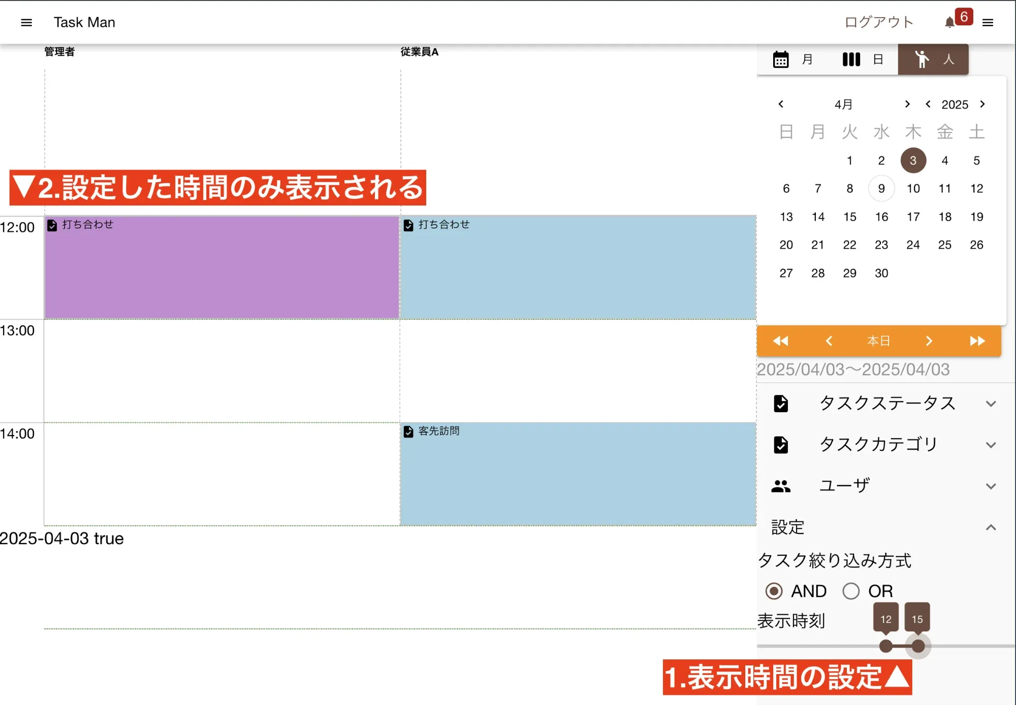 - チェックの入っているスタッフが担当のタスクのみ表示されます。複数選択可能です