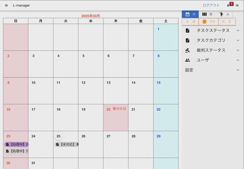 画面右パネルから「月」を選択すると月間カレンダーに表示が切り替わります。