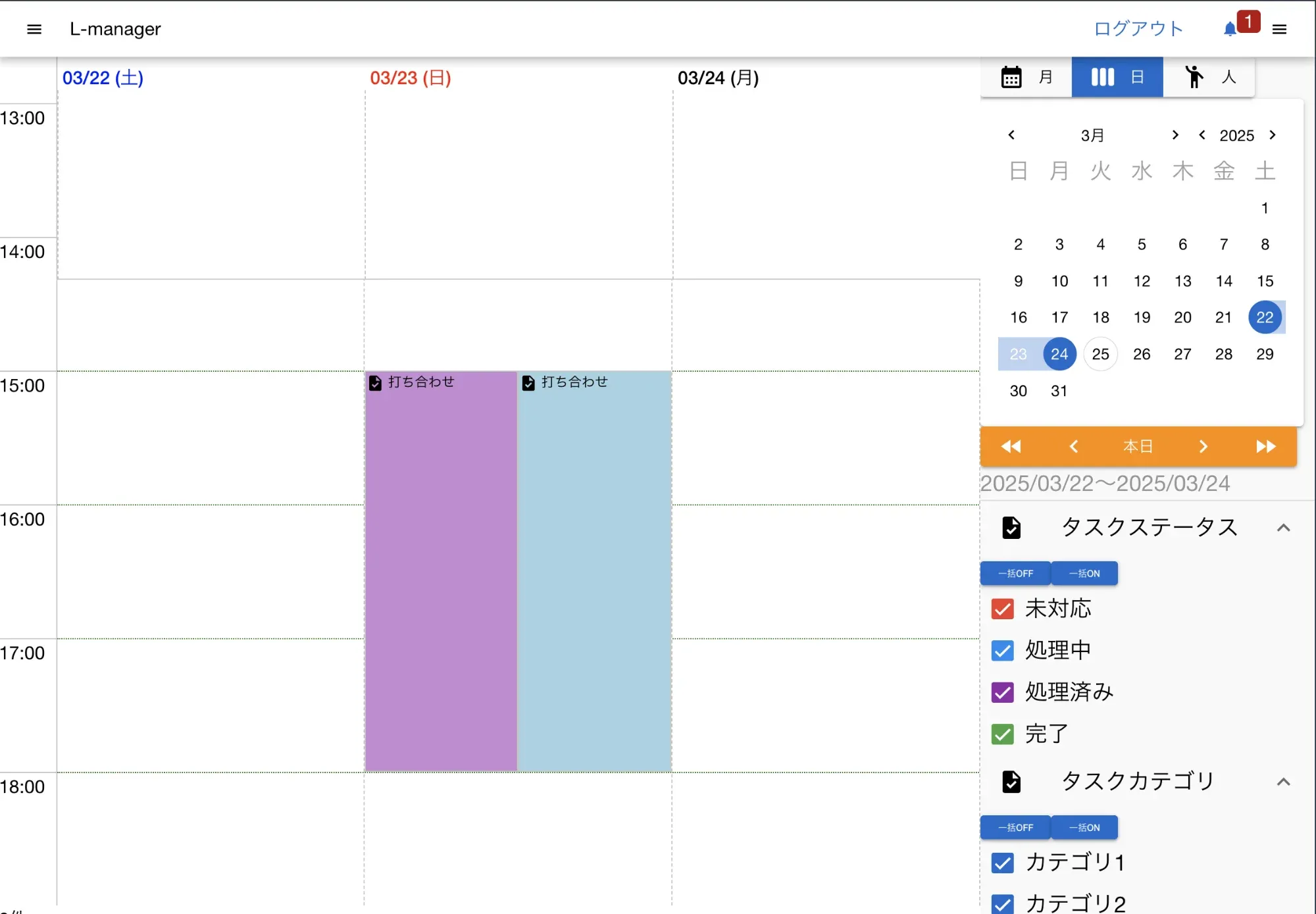 Section titled “カレンダーの表示期間を変更する {#change_calendar_range}”週間カレンダーという名称ですが表示する期間は「週」に囚われず、任意に変更が可能です。 右パネルのミニカレンダーを操作することで表示期間を変更できます。