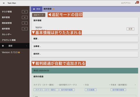 基本情報を変更せず、裁判の経過を追記したいときはヘッダーの「裁判記録追記」をクリックします。通常の作成画面と以下の点が異なります
