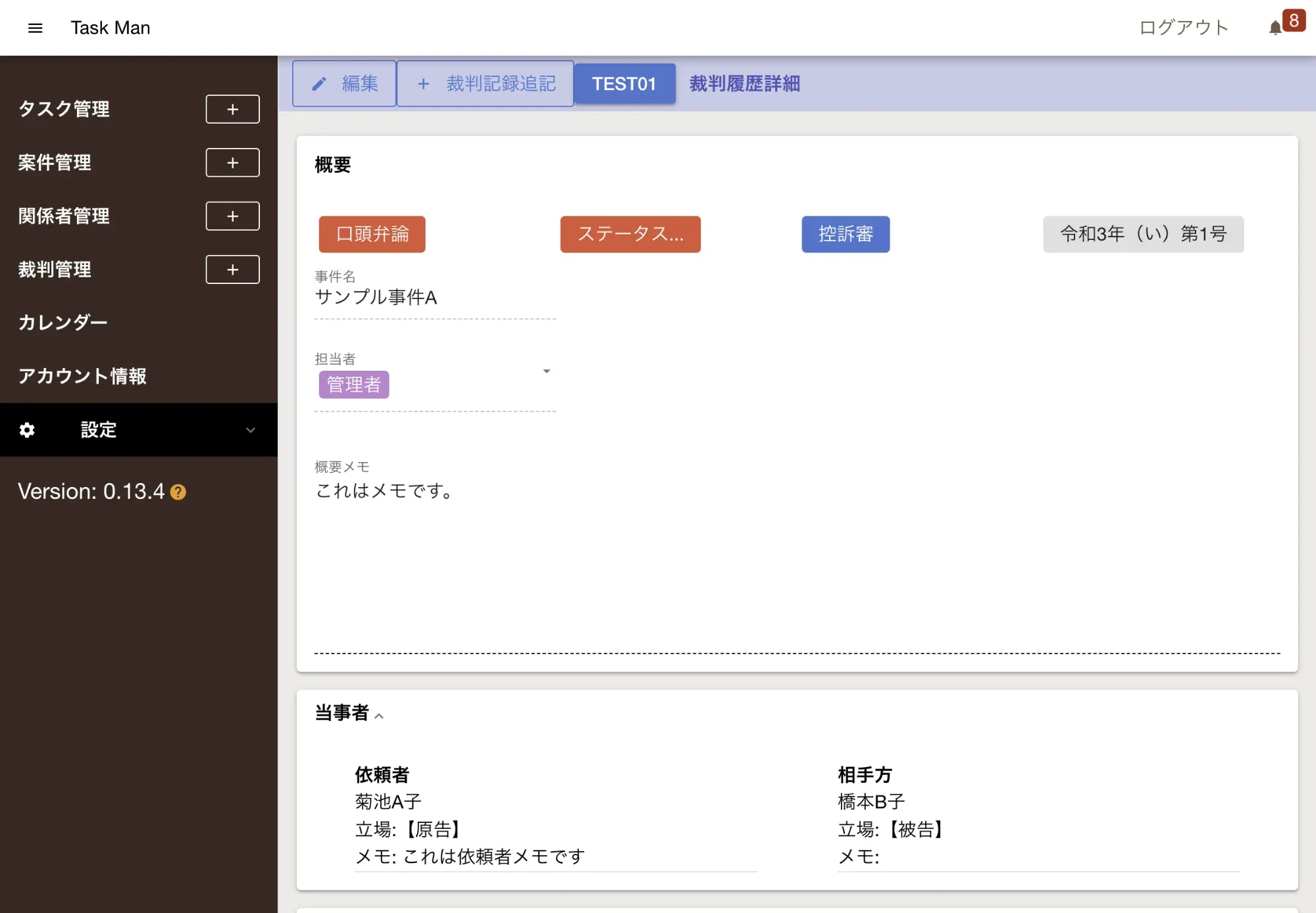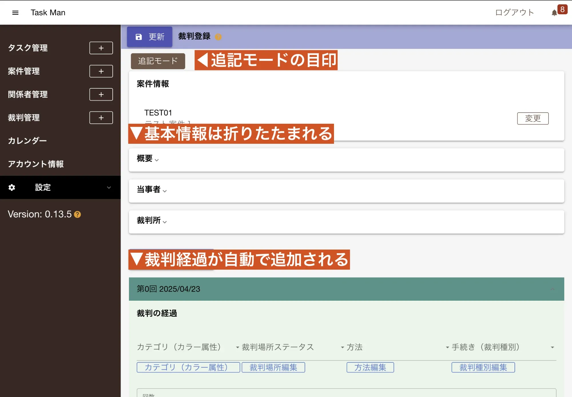 Section titled “裁判記録を追記する”基本情報を変更せず、裁判の経過を追記したいときはヘッダーの「裁判記録追記」をクリックします。通常の作成画面と以下の点が異なります