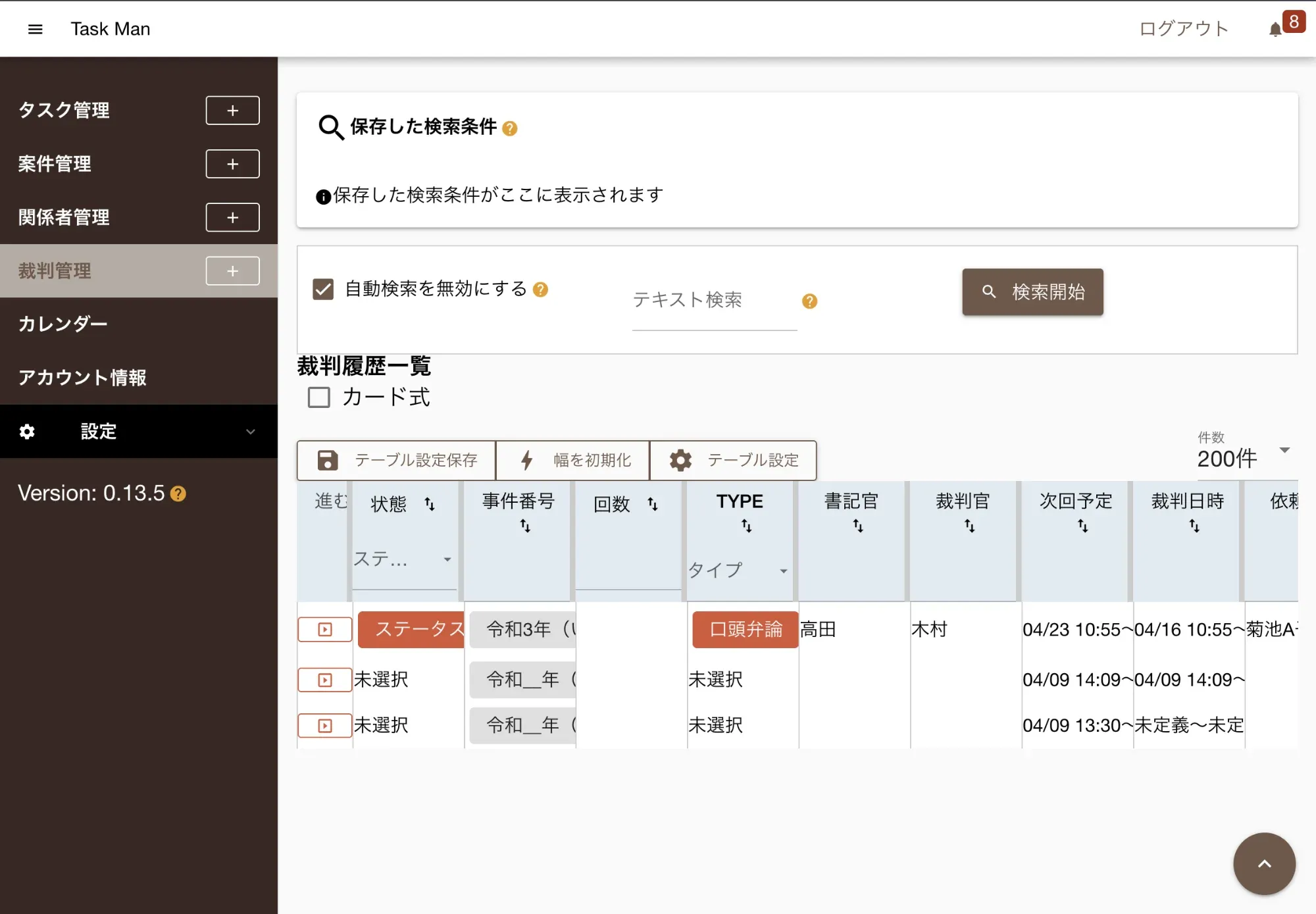 登録されている裁判を見るには、左メニュー「裁判管理」をクリックします。