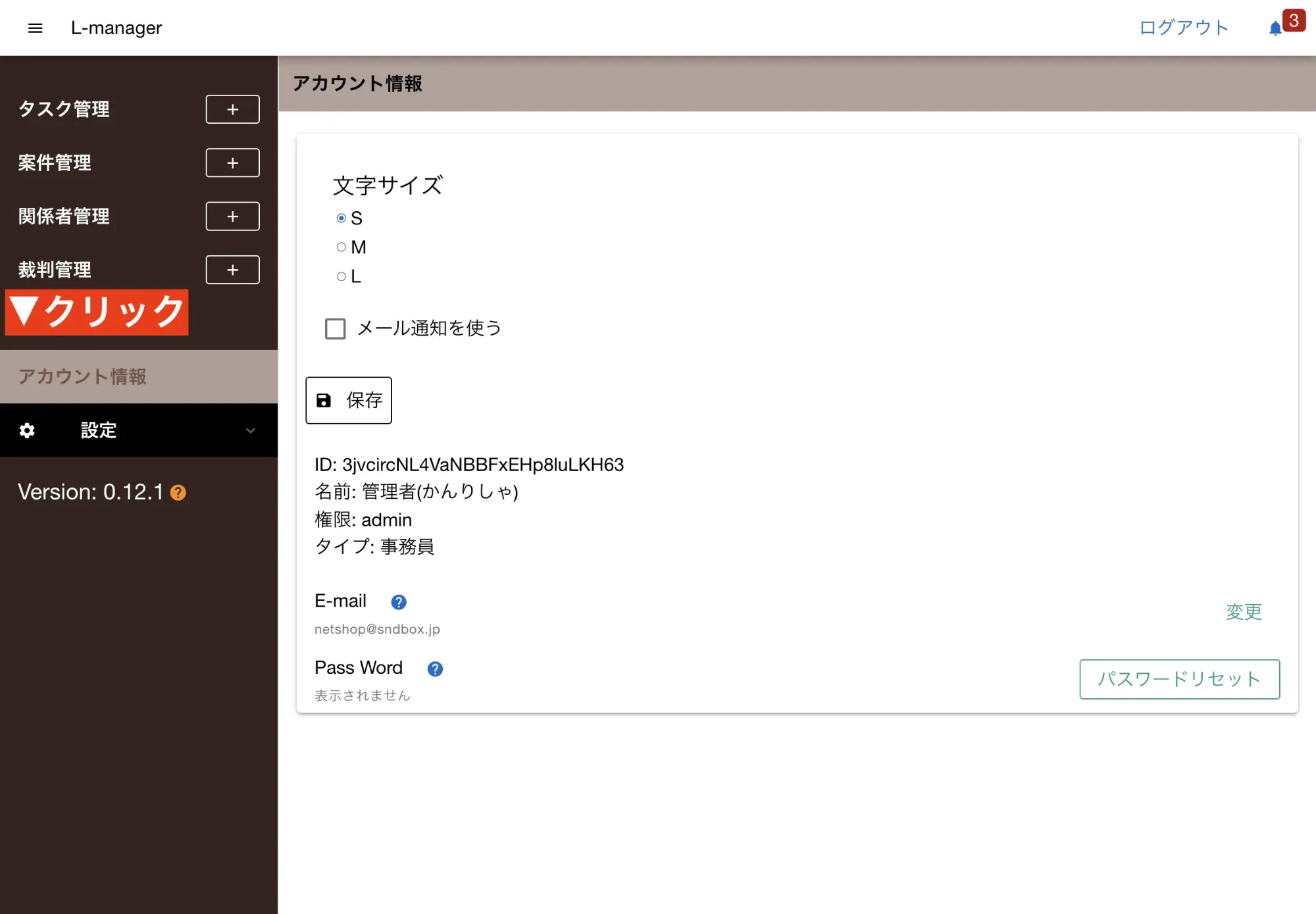 - ご利用中の権限が表示されます。管理者(Admin)またはスタッフ(Staff)の2種類があります