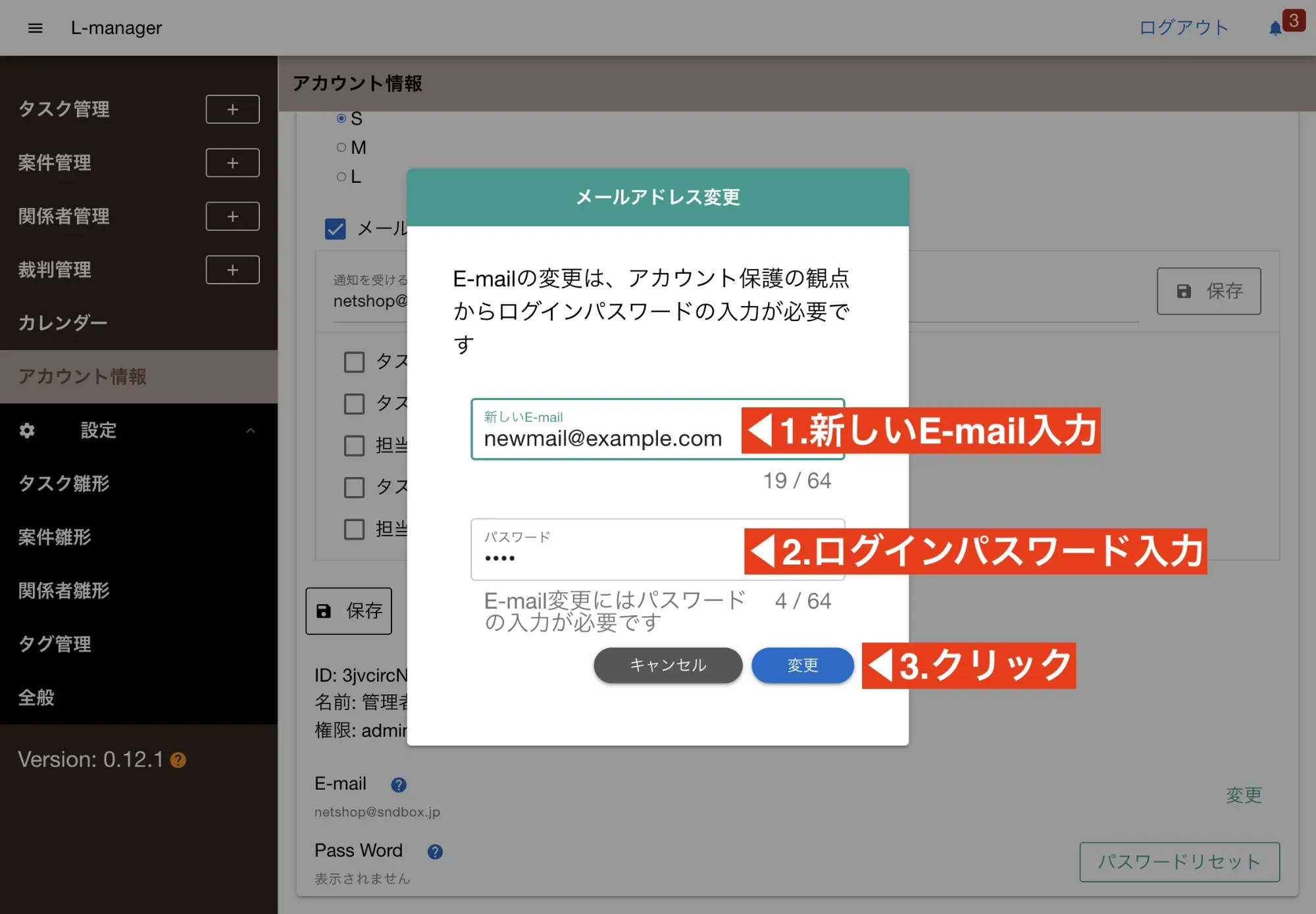 Section titled “ログインE-mailを変更する”E-mailの行にある「変更」ボタンをクリックするとログインメールアドレスの変更ウインドウがポップアップで表示されます。