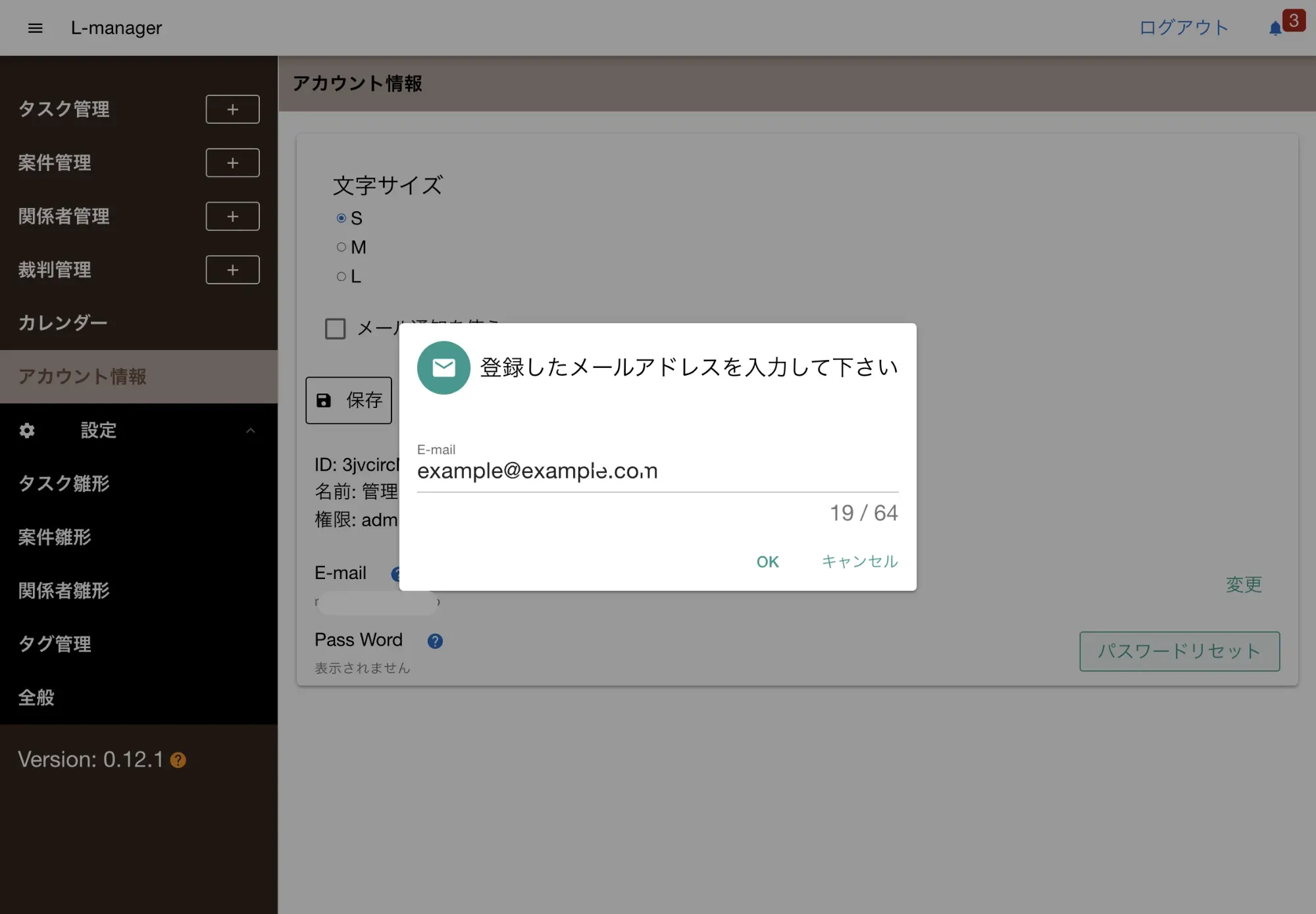 Section titled “ログインパスワードを変更する”「パスワードリセット」ボタンをクリックすると、メールアドレスの入力ウインドウがポップアップで表示されます。