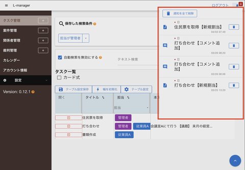 通知はそれぞれがリンクとなっており、通知をクリックすると通知のもととなった案件やタスクにページが遷移します。