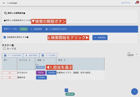 シンプルなケースとして、担当者による絞り込み検索をしてみましょう。