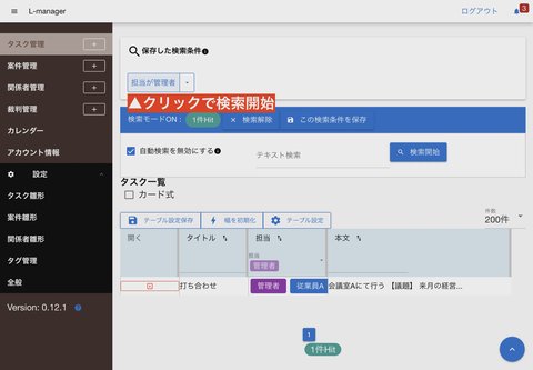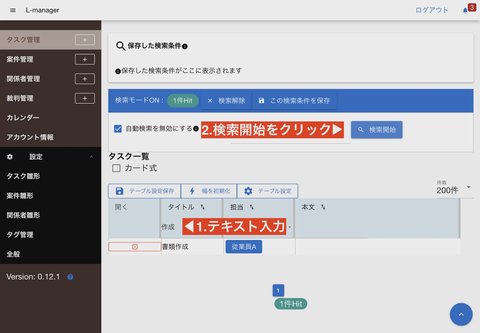 タスクのタイトルやタスク内容など、「文字データ」を検索するには文字を入力して検索できます。