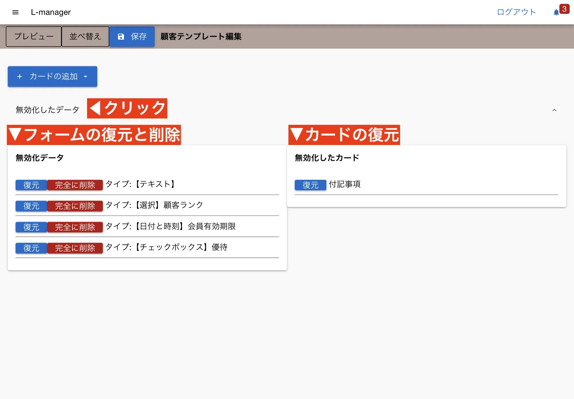 Section titled “削除について”不要になったカードや入力フォームの削除についてはこちらをご覧下さい