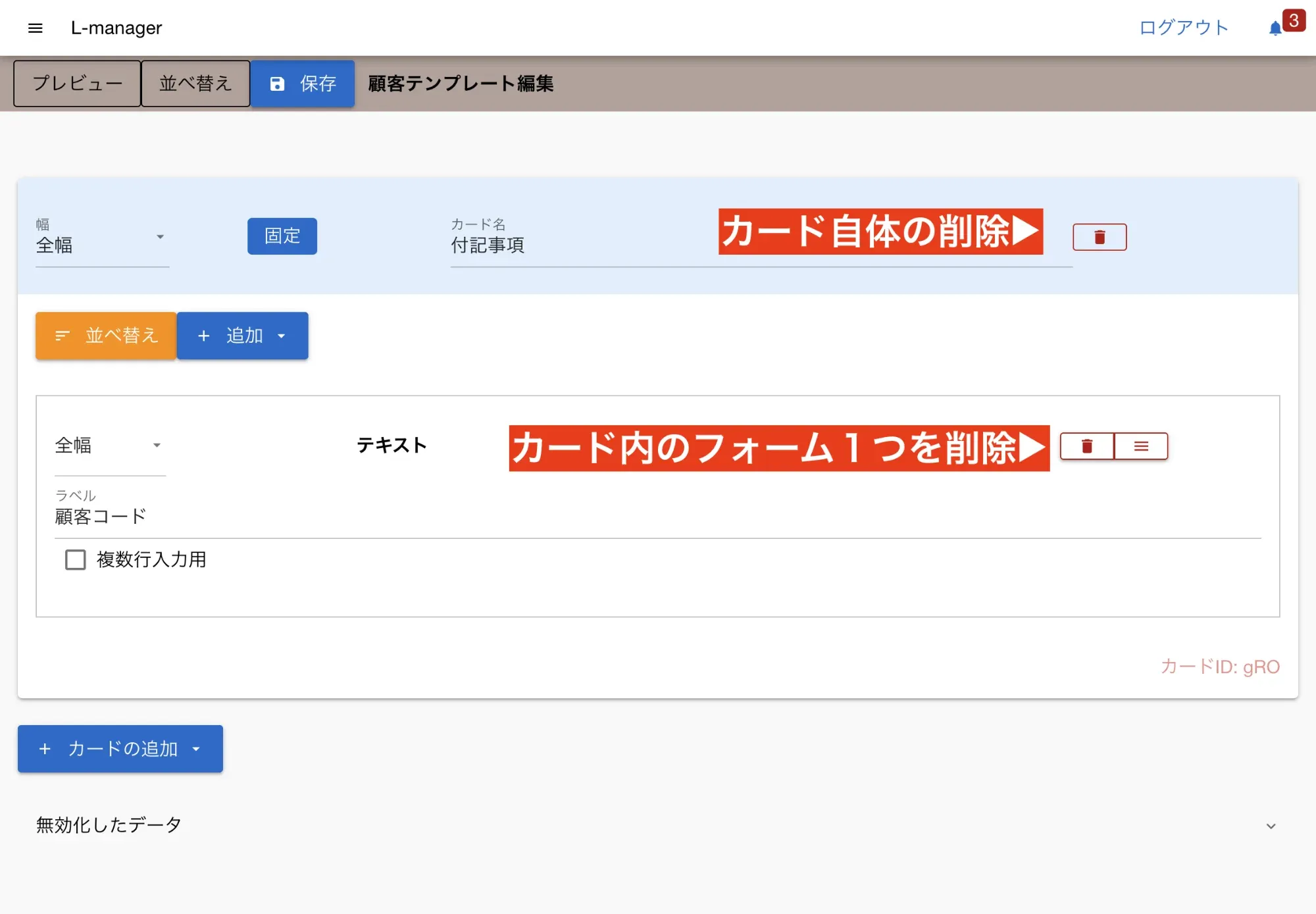 カード自体の削除と、カード内の入力フォームの削除、2種類の削除があります。