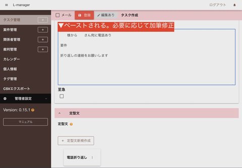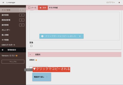 - 「↓定型文」をクリックすると、保存した定型文のタイトルが表示され、タイトルをクリックすると、クリップボードにコピーされ、「本文」の上でペースト(右クリック→貼り付け)することで、定型文を本文に反映させることができます