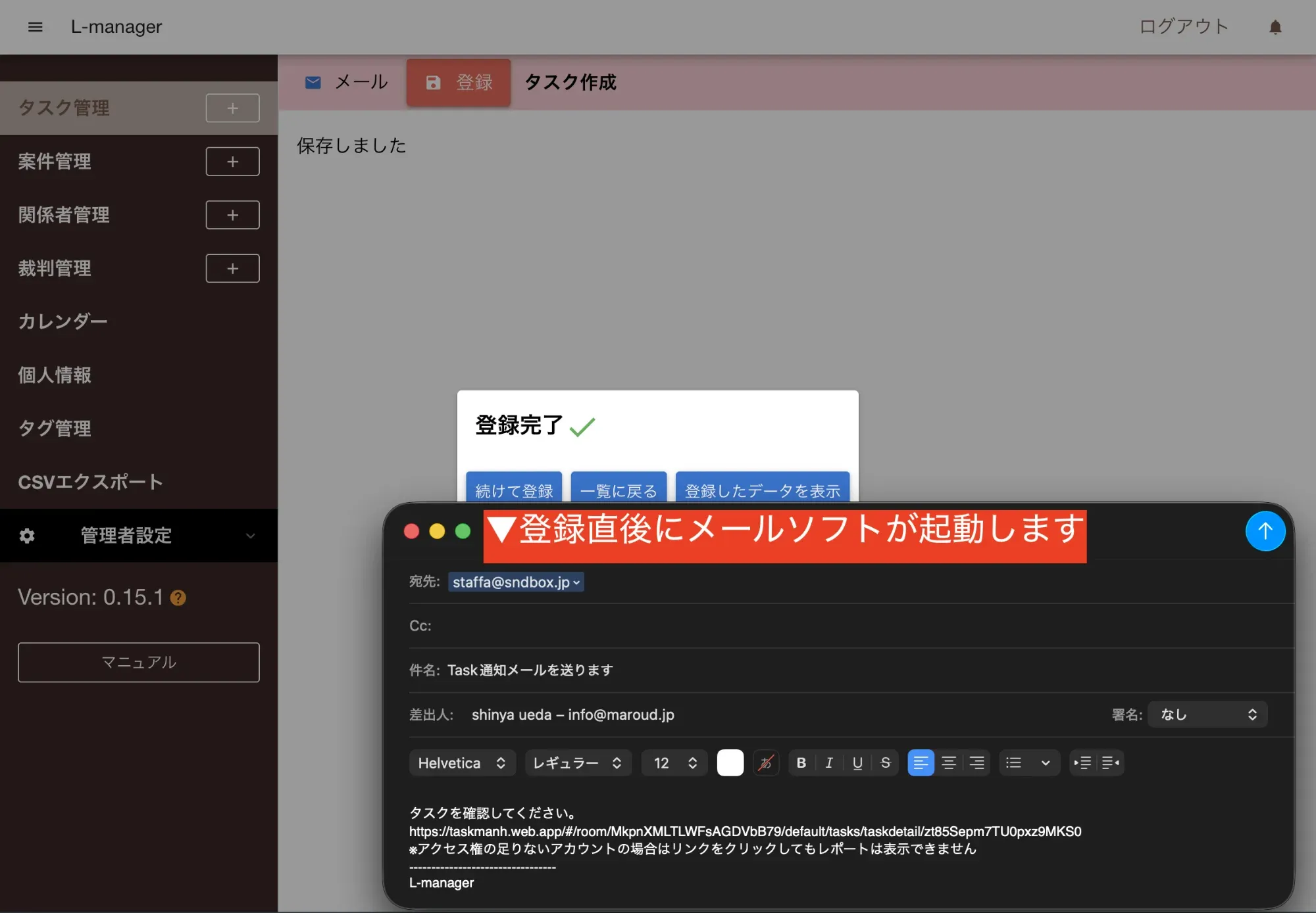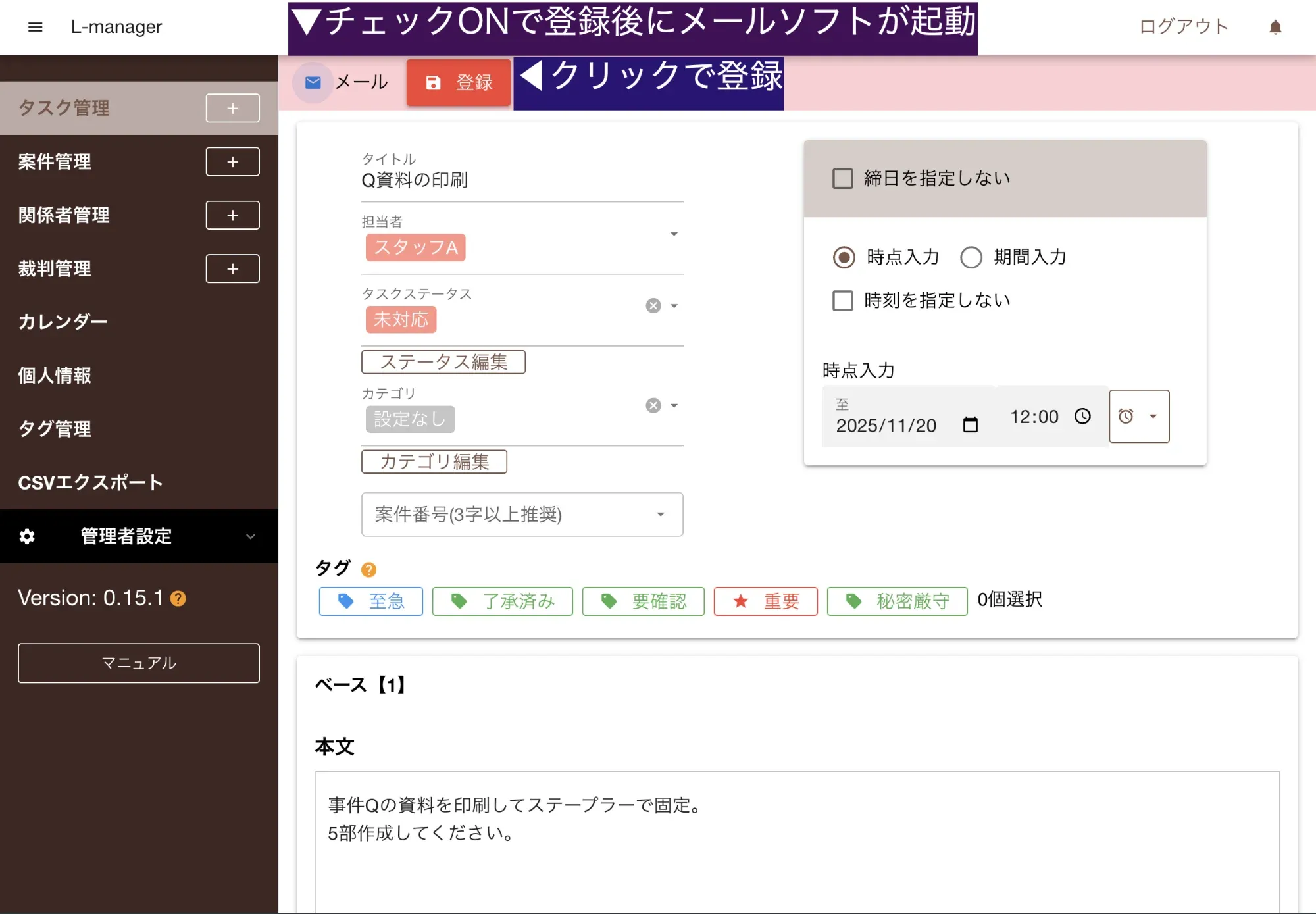 タスク登録を「担当者」にメール通知する場合には、「□メール」にチェックを入れる(「2 スタッフ登録」の際に登録した担当者のメールアドレスに送信されます)