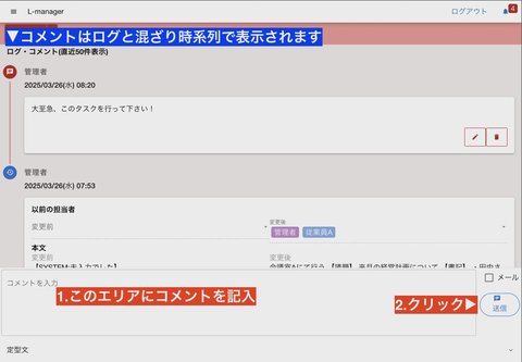 表示中のタスクに対してコメントを残すことが出来ます。ページ下部の「コメントを入力」欄にコメントを記入し、送信ボタンを押すことでコメントが書き込まれます。 コメントを書くとタスクの担当者に対して画面右上の通知に表示されます。